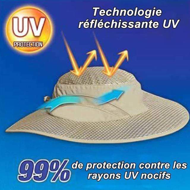 Notre chapeau révolutionnaire est doté d'une barrière anti-UV intégrée qui reflète 80% de la chaleur du soleil et 99% des rayons UV nocifs, vous permettant également de conserver une température allant jusqu'à 20 degrés.