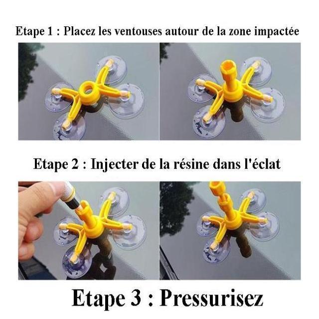 Il vous faudra tout simplement placer les ventouses de la pièce principale du kit autour de la zone impactée puis injecter de la résine dans l'éclat.