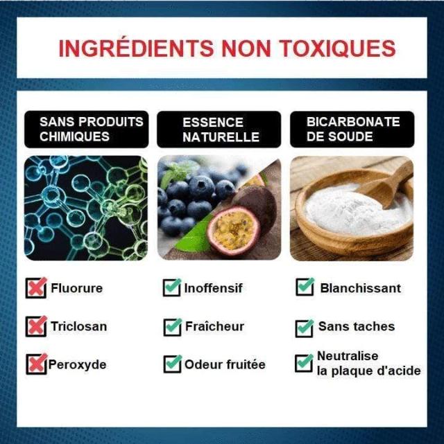 Contrairement au dentifrice blanchissant ordinaire contenant des abrasifs et des produits chimiques nocifs , ce dentifrice sans fluor peut, grâce à la réaction chimique du bicarbonate de soude dissous, pénétrer dans les crevasses de l’émail et éliminer les particules alimentaires, la plaque bactérienne et les taches profondes incrustées .